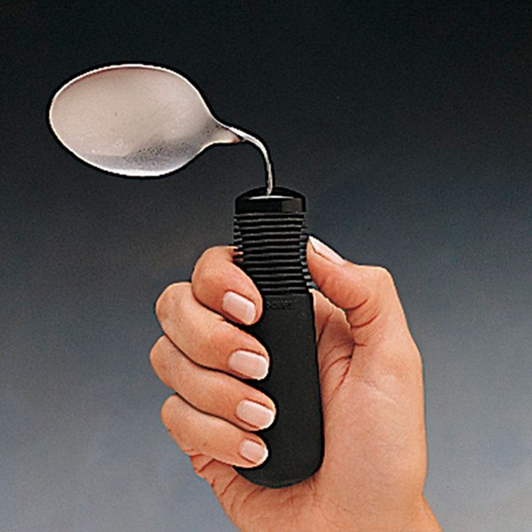 El mango es ancho y suave. Proporciona un agarre cómodo y la cuchara se puede doblar al ángulo preferido hasta 90°. Muy práctico para aquellas con movilidad reducida en la muñeca, tanto para personas diestras como zurdas.